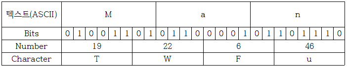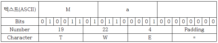 Man이란 단어를 Bit로 8개씩 3단어 총 24Bit로 나열한 다음 이를 6Bit로 나눠서 이를 치환한 결과입니다.